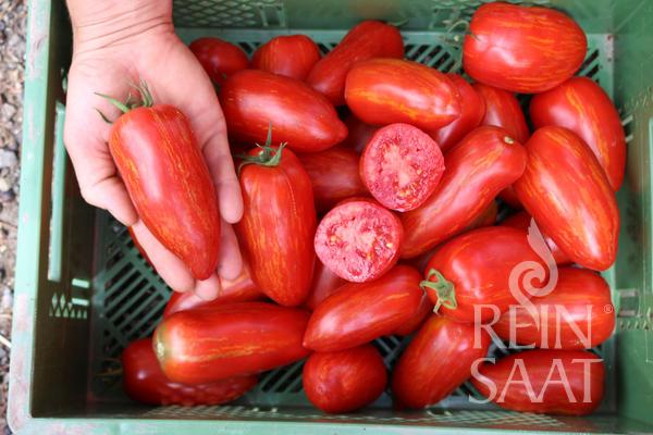 Výnimočná fľaškovitá paradajka s atraktívnym červeno-žlto-oranžovým plameňom. Dlhé oválne plody s hrotom naspodu sú mimoriadne pevné, mäsité a aromatické. Ideálne do omáčok a šalátov. Hmotnosť ovocia cca. 100 – 150 g. Veľmi výnosná odroda.